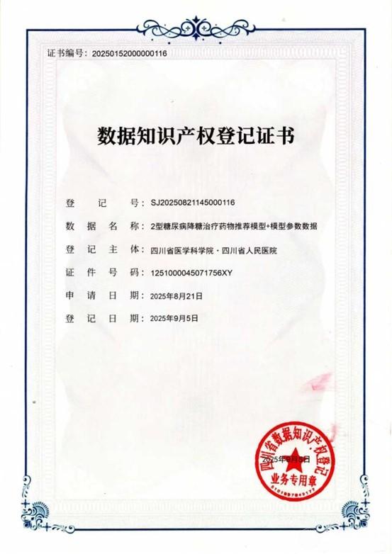 本次登记的数据资产对象名为“2型糖尿病降糖治疗药物推荐模型”的参数数据,该模型在国家科技重大专项——“重大慢病防治技术推广机制研究及应用示范”的支持下,由中国科学院院士、我院党委书记、院长杨正林牵头,科研部、四川知识产权运营中心省人民医院中心与药学部科研人员协同完成。能够根据患者特征,为2型糖尿病患者生成高价值的个性化药物治疗方案。模型基于多中心医疗大数据构建,采用一万余例2型糖尿病患者数据进行测试,并在一项前瞻性随机对照试验中验证了模型的安全性与有效性。通过数据知识产权登记,明确了该模型数据的权属、边界和价值,为后续数据合规流通奠定了基础,为数据的安全存储、流通共享和开发利用提供了法律保障。