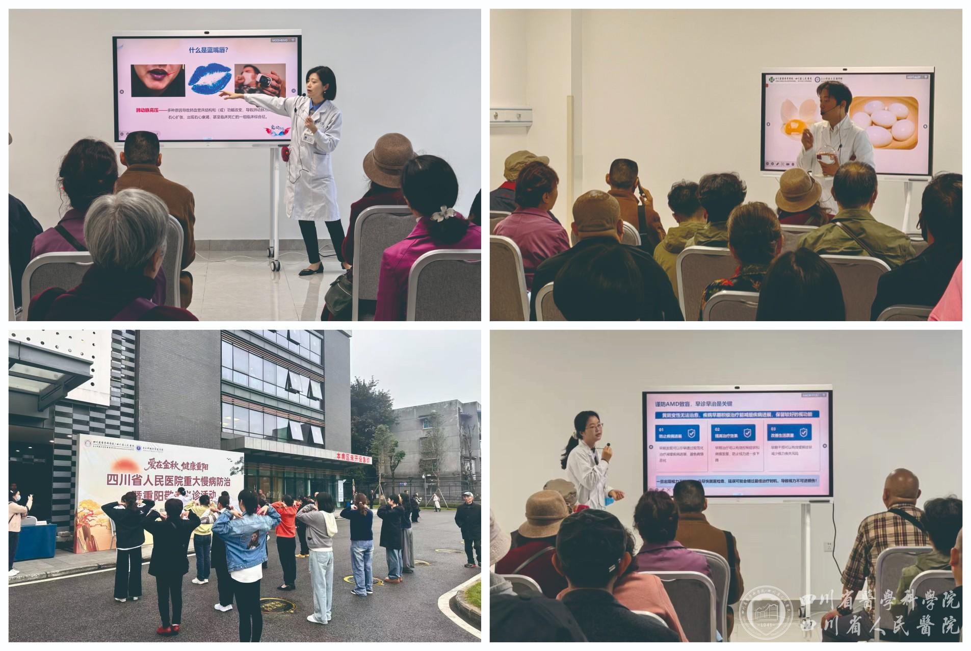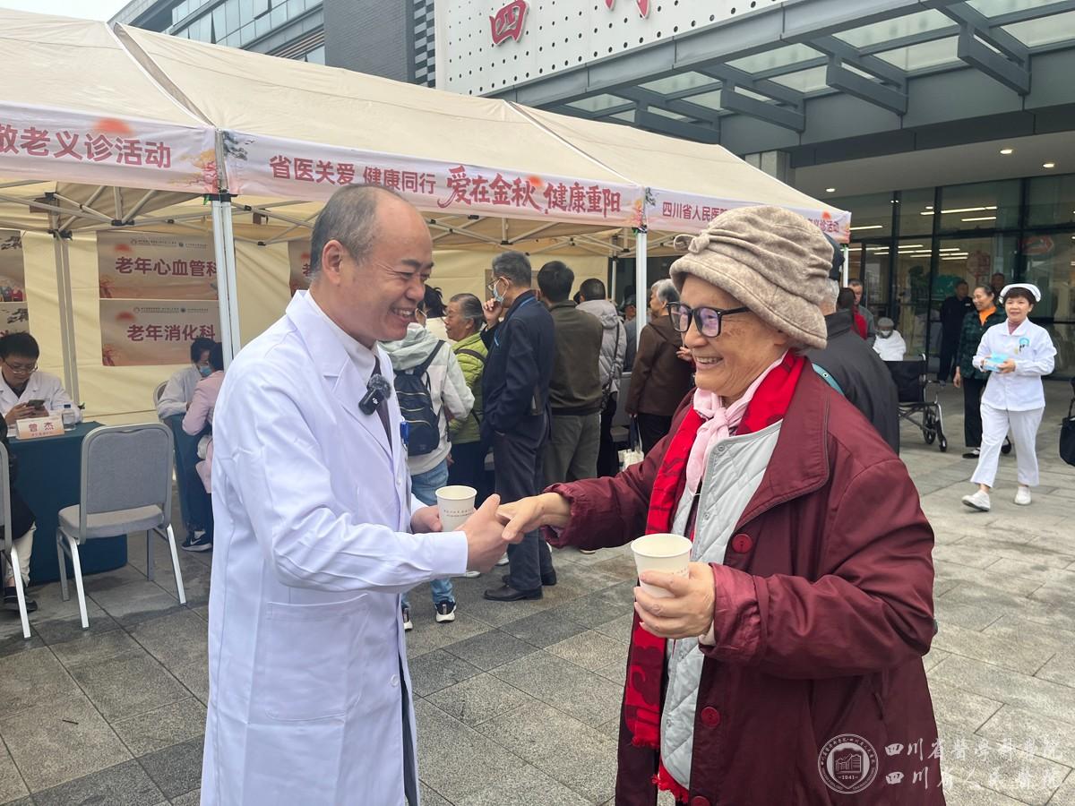 10月29日重阳节,为弘扬尊老敬老爱老传统美德,在四川省精神文明建设办公室指导下,在院领导的支持下,我院主办的“爱在金秋 健康重阳”重大慢病防治暨重阳敬老义诊活动在四川省人民医院草堂院区举行。医院组建多学科专家团队,为老年朋友献上了涵盖义诊、科普讲座、急救培训、呼吸操锻炼、养生茶品鉴的“健康重阳礼”。院党委书记、院长杨正林,党委副书记周陵,党委常委、副院长傅启华在现场与老年朋友共话佳节。